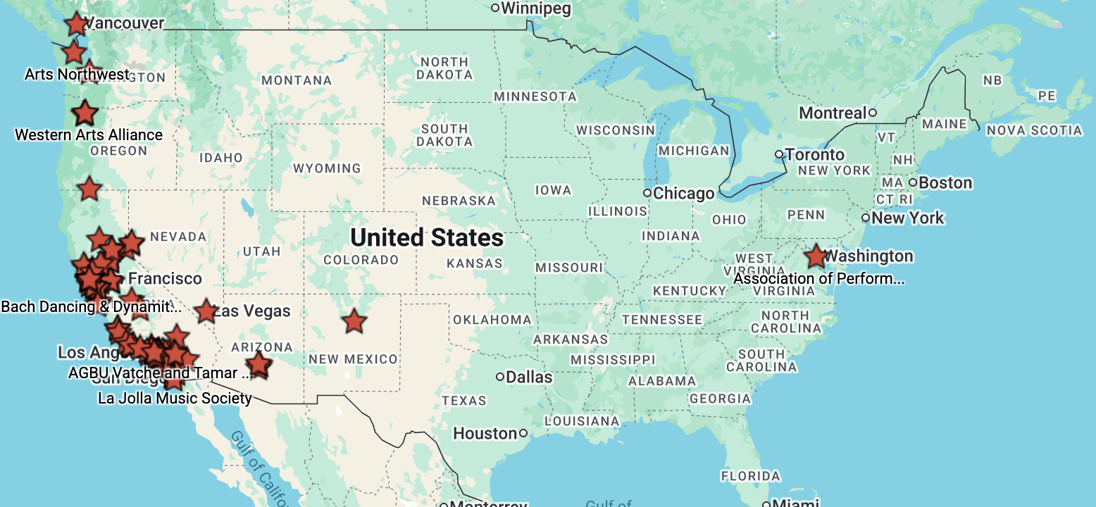 Thanks to David Palmer, California Presenters' Board Secretary/Treasurer for creating an interactive tour routing map showing the locations of the presenting venues in California and surrounding states! Useful to agents, artists and presenters alike, the map can be accessed here.